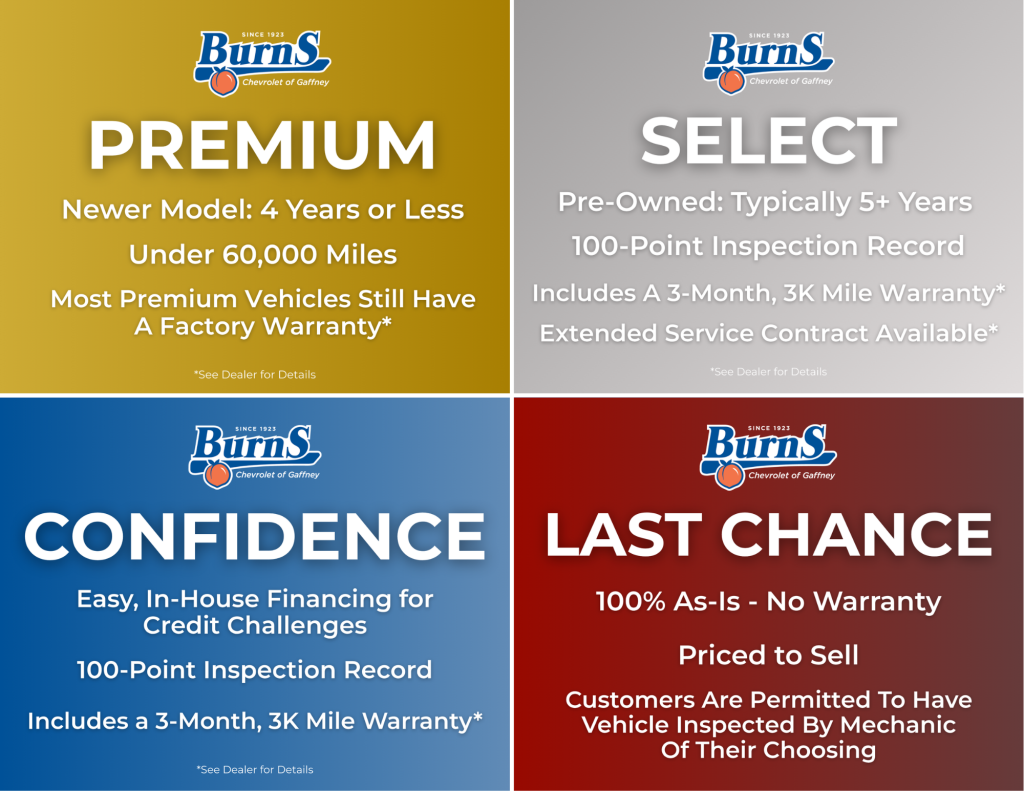 At Burns Chevrolet of Gaffney, our team is here to answer your questions, explain the fine print, and help you decide what’s right for you. Whether you’re buying a Premium model or a Last Chance deal, we’re committed to your satisfaction, safety, and confidence on the road.Ready to explore your options? Visit Burns Chevrolet of Gaffney today or browse our online inventory.